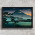 Curator's notes: Mount Fuji from Lake Sai, Evening is a breathtaking masterpiece of art by Tsuchiya Koitsu, a prominent Japanese painter known for his picturesque landscapes. This particular piece of art, exudes a sense of serenity and tranquility as it depicts the majestic Mount Fuji, the highest mountain in Japan, looming in the background. The painting captures the moment of dusk, as the sun sets over the lake, casting a warm and mellow glow over the scene. The lake is placid and serene, reflecting the image of the mountain, creating a perfect mirror image. The colors used in this piece are soft and subdued, creating a feeling of calm and serenity. The painting is a true ode to the natural beauty of Japan, and the artist's ability to capture the essence of the scene is truly remarkable.