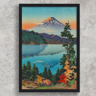 Curator's notes: Lake Ashi in the Hakone Hills is a picturesque and serene body of water located in the Hakone region of Japan. The lake is surrounded by lush, verdant hills, and is often depicted in art as a place of natural beauty and tranquility. One such depiction is a print by the famous Japanese artist Tsuchiya Koitsu, entitled "Lake Ashi in the Hakone Hills in Early Autumn." The print captures the idyllic and ethereal ambiance of the lake during the autumn season. The water is depicted as a tranquil expanse of serenity, with the autumnal hues of the surrounding hills providing a striking contrast. The image is a feast for the eyes, with the intricate details of the trees and the reflections on the water, as well as the use of vibrant colors, creating a harmonious and evocative scene. It is a true masterpiece that showcases the artist's virtuosity in capturing the essence of the lake in the most picturesque time of the year.